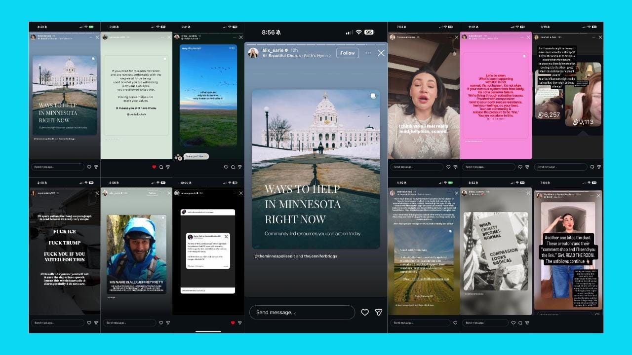 What’s happening in Minnesota is the final straw for those who have stayed silent this past year or more likely, this past decade, and this post gave them the chance to finally say “I can’t stay quiet anymore, even if it hurts my bottom line”. It was deemed by the creator economy (or their managers) that this was THE ONE to post to appease your audiences, or safe enough to dip your toe into political content. It’s a good post; it shares resources about how to help folks in Minnesota. It gives tangible action steps to take, so it feels better than just talking about feelings.
